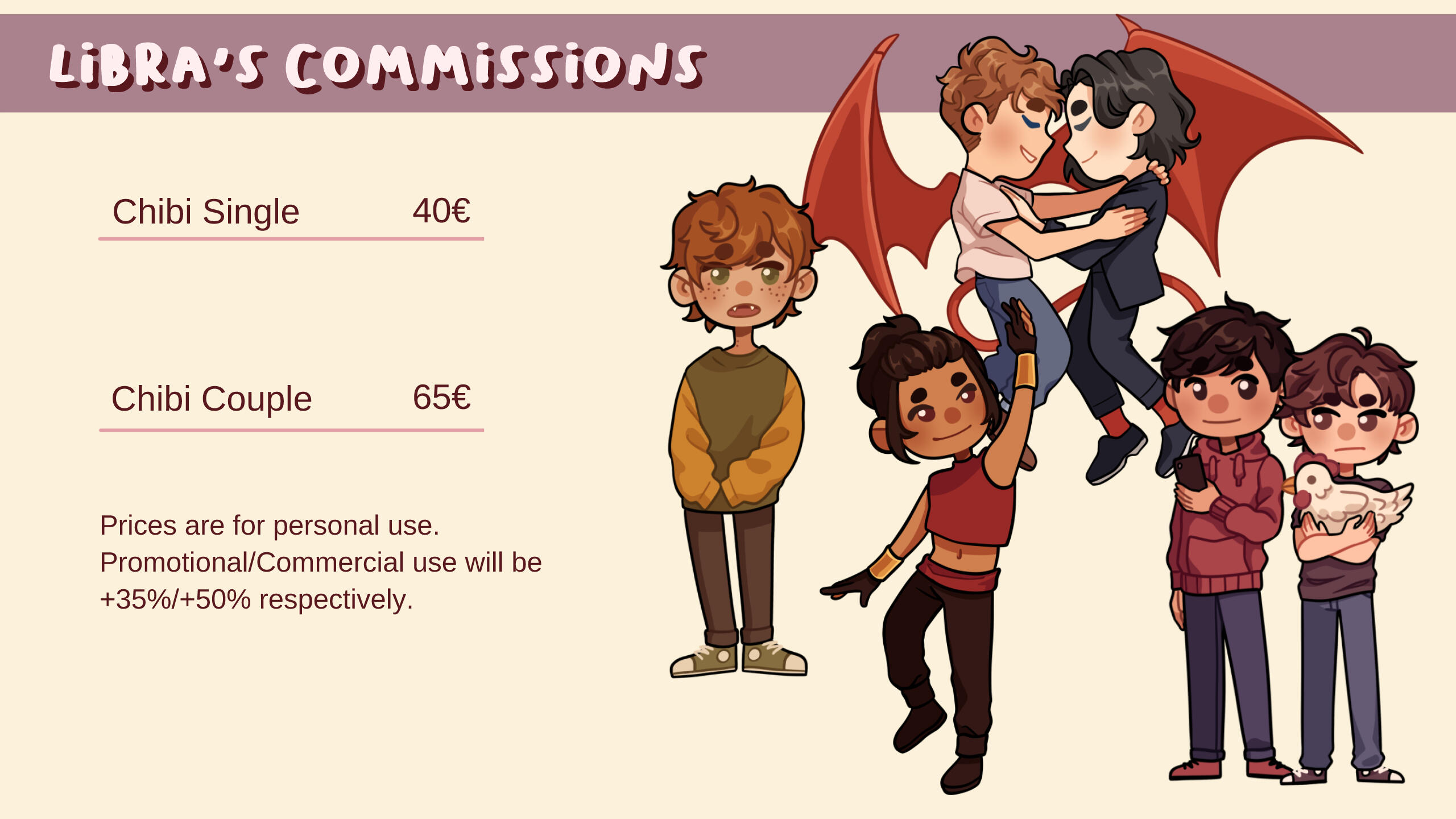 The prices are the base price for personal commissions. I reserve the right to charge extra for more complex illustrations. Complicated backgrounds, props or animals will cost extra, depending on complexity. Simple backgrounds, like single colors or gradients, are included in the normal price.